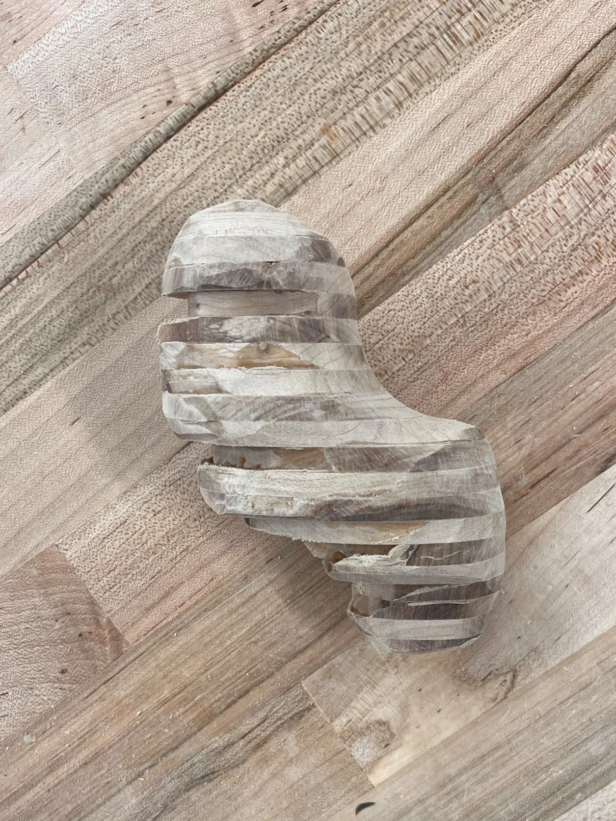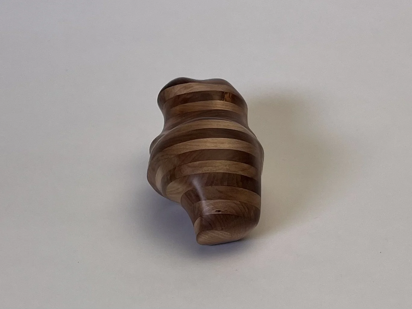 I sliced clay model into 20 horizontal sections which were then used as a template to assemble a rough wooden structure from 20 thin individual pieces. I then began the process of machine and hand-sanding to further develop and define this unique product.